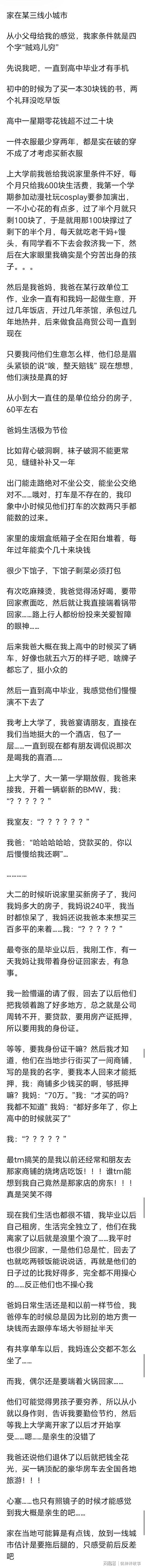 如果是真的,我有点心疼你妈啊。有钱不享受生活,存起来留给孩子。人生几十年很短,住上好房子,吃好的,用好点,一年旅游几次,钱用来改善生活,享受幸福才是正确的用法,又不是没钱,不是么。